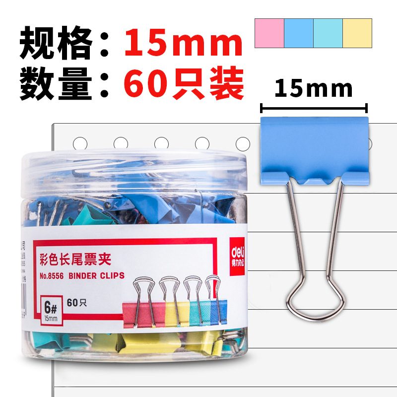 - 商品名稱:得力8556彩色長尾票夾6#15mm60只裝
